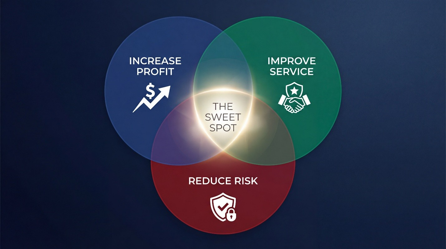 Lower costs enable better service when you eliminate waste rather than capability. Better service drives profitability when reliability replaces heroics. Lower risk improves both when you build systematic processes instead of adding bureaucracy.